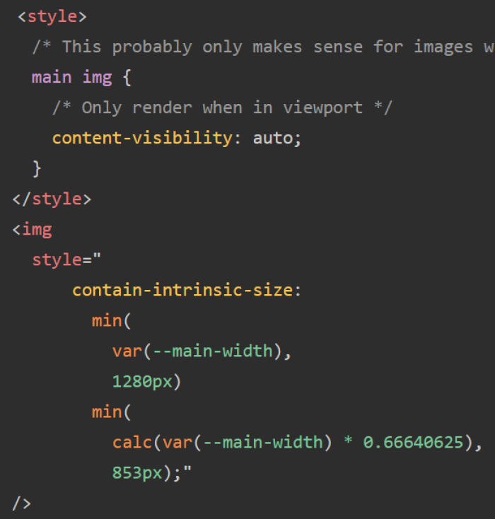 CSS 속성의 "content-visibility"를 지정하는 것으로, CPU 리소스 사용량을 최적화 할 수있다. 또한 content-visibility 속성을 지정하는 것만으로는 CLS를 악화시킬 수 있으므로, contain-intrinsic-size 속성에서 요소의 크기를 브라우저에 알릴 필요가 있다라는 것. 이 경우 img 요소에 widht와 height를 지정하는 경우와는 달리, 화면 비율도 지정해야한다.