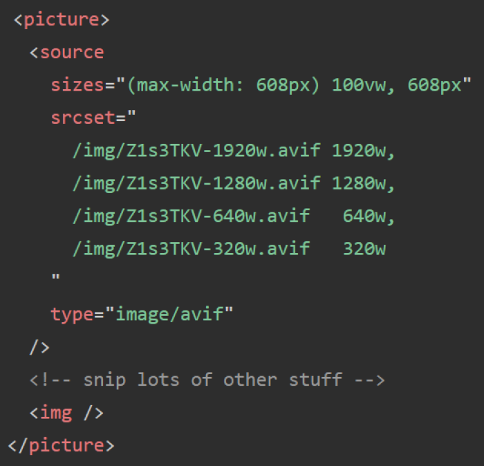AVIF는 현시점에서는 Chromium 브라우저만 기본적으로 지원하는 이미지 포맷으로, jpeg 보다 지속적으로 높은 성능을 가지고있다고 한다. AVIF를 사용하는 경우는 "picture" 요소를 이용하여 다음과 같이 코드를 작성. picture 요소 자체는 레이아웃을 가지고 있지 않고, 실제로 렌더링되는 것은 img 요소라고 설명되어있다.