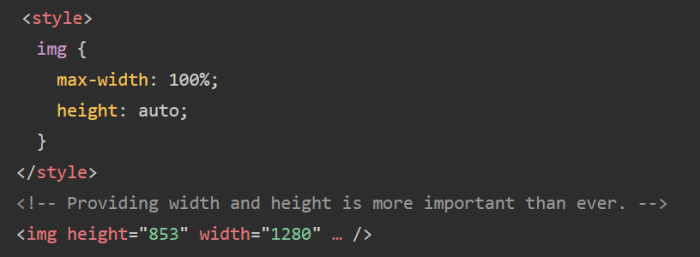 화면 비율을 유지하면서 이미지 크기를 변경하려면, "style" 요소에 "max-width : 100%"나 "height : auto"라고 지정해 두는 방법이 자주 사용된다. 이 방법 외에도 "img" 요소에 "widht"와 "height" 속성을 지정하는 것으로, 웹 브라우저는 이미지를 다운로드하기 전에 이미지의 위치를 확보 할 수 있기 때문에, 레이아웃 붕괴의 지표인 CLS를 개선가능하다는 것.